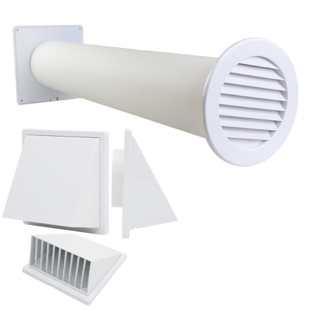 Zestaw wentylacyjny przez ścianę to kompletne rozwiązanie do skutecznej wymiany powietrza w pomieszczeniach mieszkalnych, biurowych lub użytkowych. W skład zestawu wchodzą wszystkie niezbędne elementy: rura przelotowa 0,5m, kratka wewnętrzna biała oraz zewnętrzna kratką z okapem i klapą zwrotną którą można zdemontować w razie potrzeby.
